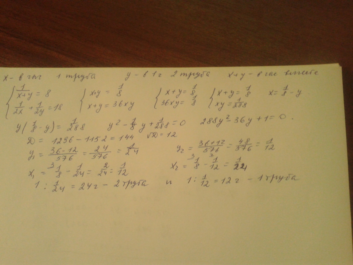 Если открыть одновременно две трубы, то бассейн будет наполнен за 8 часов. Если сначала первая труба наполнит половину бассейна, а затем другая труба – вторую его половину, то весь бассейн будет наполнен за 18 часов. За какое время может наполнить этот бассейн каждая труба, работая отдельно?
