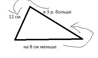 Одна сторона треугольника равна 12см, вторая сторона в 3 раза больше первой, а третья-на 8см меньше второй. Найдите периметр треугольника. Чертёж нужен срочно.