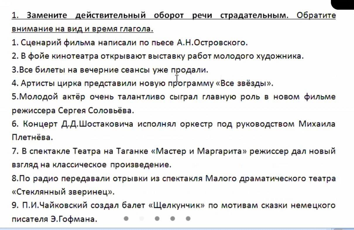 Ответ: 1. Сценарий фильма написан по пьесе А.Н. Островского. 2. В фойе кинотеатра открывается выставка работ молодого художника. 3. Все билеты на вечерние сеансы уже проданы. 4. Артистами цирка представлена новая программа "Все звёзды". 5. Молодым актёром очень талантливо сыграна главная роль в новом фильме режиссёра Сергея Соловьёва. 6. Концерт Д.Д.Шостаковича исполнялся оркестром под руководством Мизаила Плетнёва. 7. В спектакле Театра на Таганке "Мастер и Маргарита" режиссёром был дан новый взгляд на классическое произведение. 8. По радио передавались отрывки из спектакля Малого драматического театра "Стеклянный зверинец". 9. Балет "Щелкунчик" был создан П.И.Чайковским по мотивам сказки немецкого писателя Э.Гофмана.
