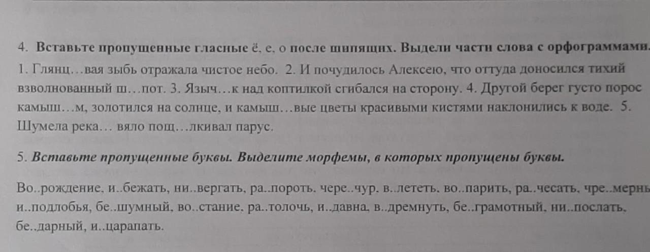 4. Вставьте пропущенные гласные е. е. о после шипящих. Выдели части слова с орфограммами. 1. Глянц...вая зыбь отражала чистое небо. 2. И почудилось Алексею, что оттуда доносился тихий взволнованный ш...пот. 3. Языч..к над коптилкой сгибался на сторону. 4. Другой берег густо порос камыш...м, золотился на солнце, и камыш...вые цветы красивыми кистями наклонились к воде. 5. Шумела река... вяло пощ...лкивал парус. 4, 5 и задания задания помогите