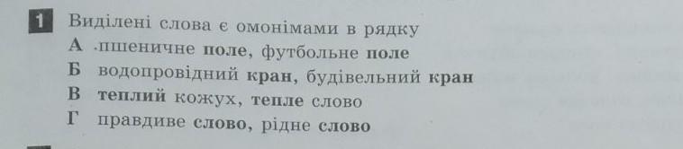 Виділені слова є омонімами в рядку А .пшеничне поле, футбольне поле Б водопровідний кран, будівельний кран В теплий кожух, тепле слово Г правдиве слово, рiдне слово