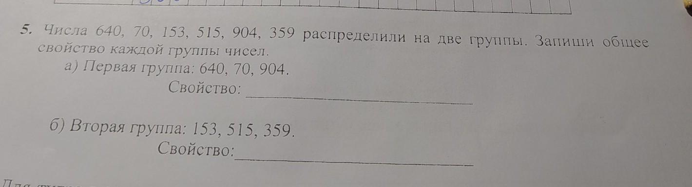 Числа 640, 70, 153, 515, 904, 359 распределили на две группы. Запиши общее свойство каждой группы чисел. а) Первая группа: 640, 70, 904. Свойство: б) Вторая группа: 153, 515, 359. Свойство: