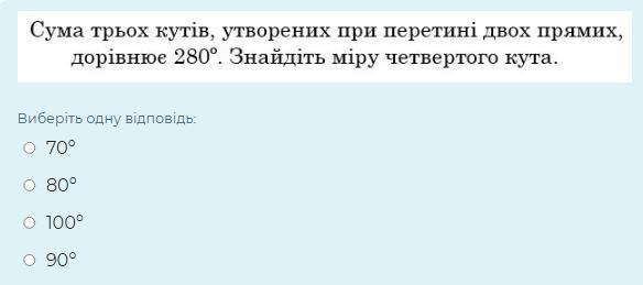 При пересечении двух прямых образуется 4 угла, сумма которых равна 360°. Нам известна сумма трёх углов, легко можем найти 4-й угол: 360°-280°=80°. Ответ: 80°.