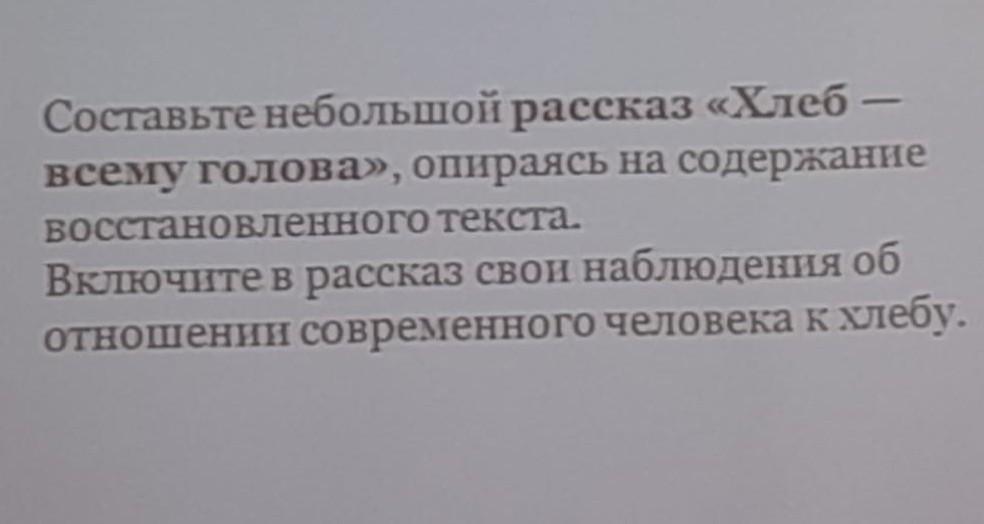 Хлеб всему голова. Как я думаю этот рассказ идёт про то что в давние времена, хлеб очень ценным, особенно во время войны. Сейчас же люди не ценят то что у них есть, тот самый хлеб который мы считаем просто выпечкой, в те времена был дорогой вещью. Современные люди даже не знают как было тяжело в прошлый времена. Я наблюдал как люди относятся к всем ценностям, и могу сказать что люди которые ценили хлеб и пытались на него заработать, знают намного больше чем современные люди.