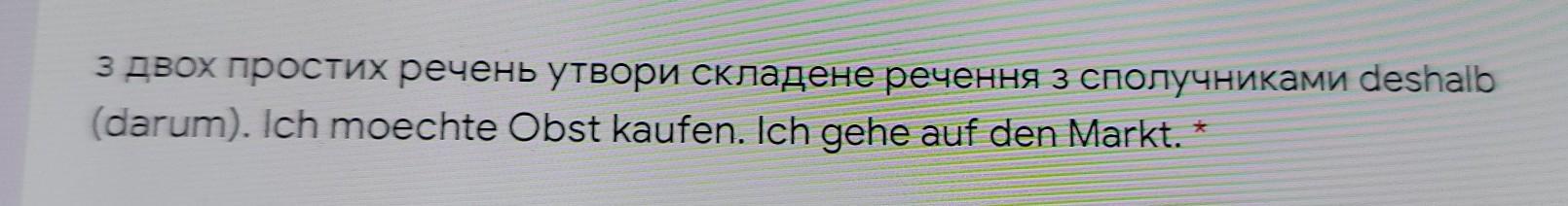 З ДВОХ простих речень утвори складене речення з сполучниками deshalb (darum). Ich moechte Obst kaufen. Ich gehe auf den Markt. *