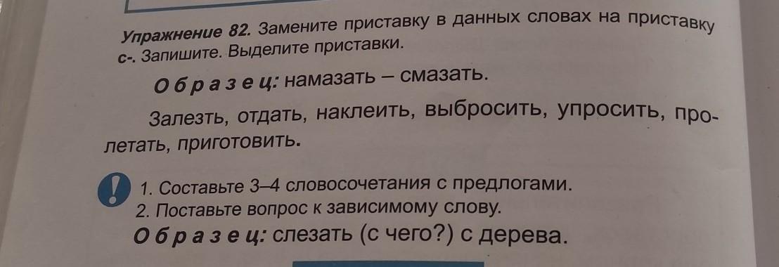 Иставку Упражнение 82. Замените приставку в данн С-. Запишите. Выделите приставки. Образец: намазать - Смазать. Залезть, отдать, наклеить, выбросить, упросить, про- летать, приготовить. 21. Составьте 3-4 словосочетания с предлогами. 2. Поставьте вопрос к зависимому слову. Образец: слезать (с чего?) с дерева. ЭТО ВАЖНО