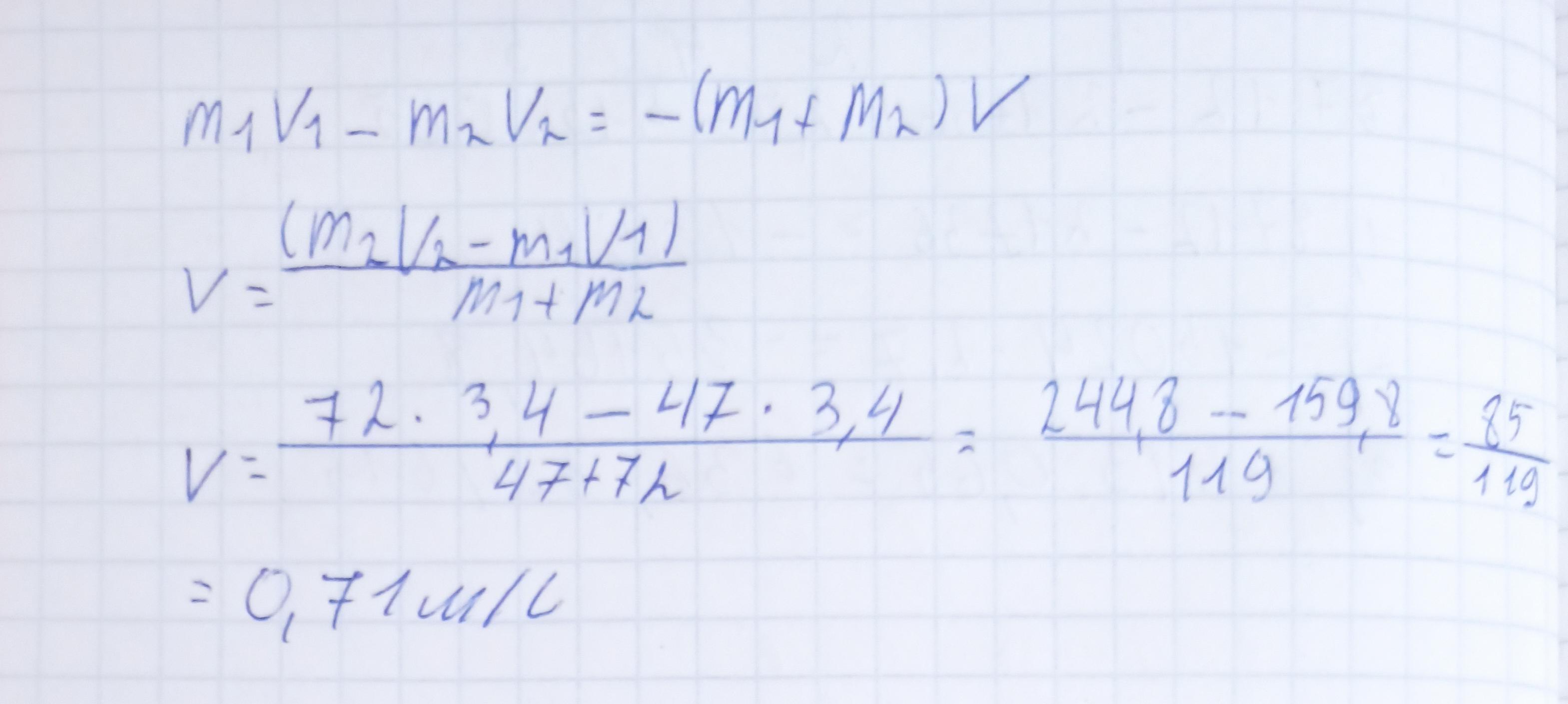 V= (47·4,5-72·3,4)/(47+72)= -33,3/119=-0,28 м/с