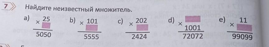 Найдите неизвестный множитель 25× =5050 101× =555 202× =2424 ×1001=72072 11× =99099