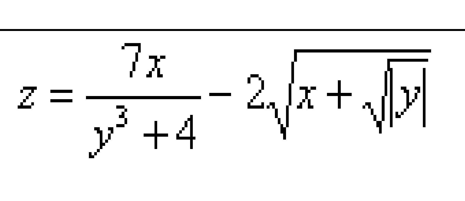 z = (7 * x) / (y ** 3 + 4) - 2 * (x + abs(y) ** 0.5) ** 0.5