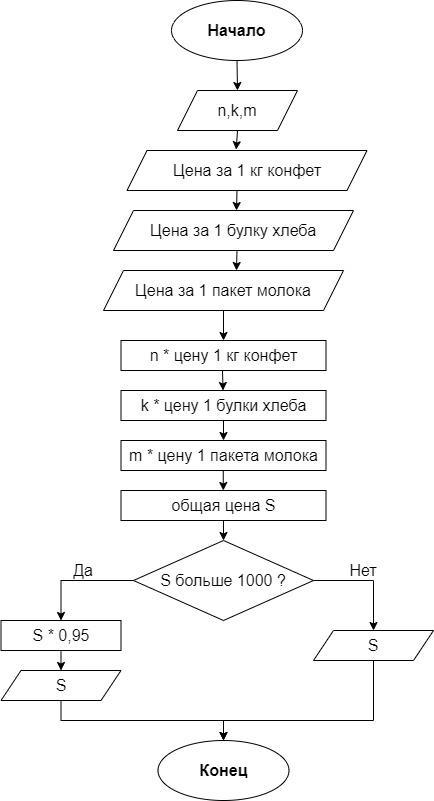 Составить блок-схему алгоритма для решения следующей задачи: Найти стоимость покупки, состоящей из n кг конфет, k булок хлеба и m пакетов молока. Цены вводятся с клавиатуры за единицу товара. Если стоимость покупки превысила 1000 руб., предоставляется скидка 5%. Рассчитать стоимость покупки с учетом скидки, если она есть.
