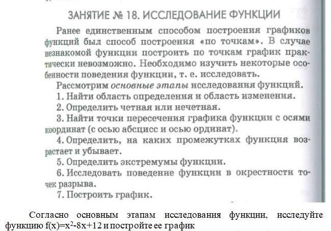 Согласно основным этапам исследования функции, исследуйте функцию f(x)=x2-8x+12 и постройте ее график