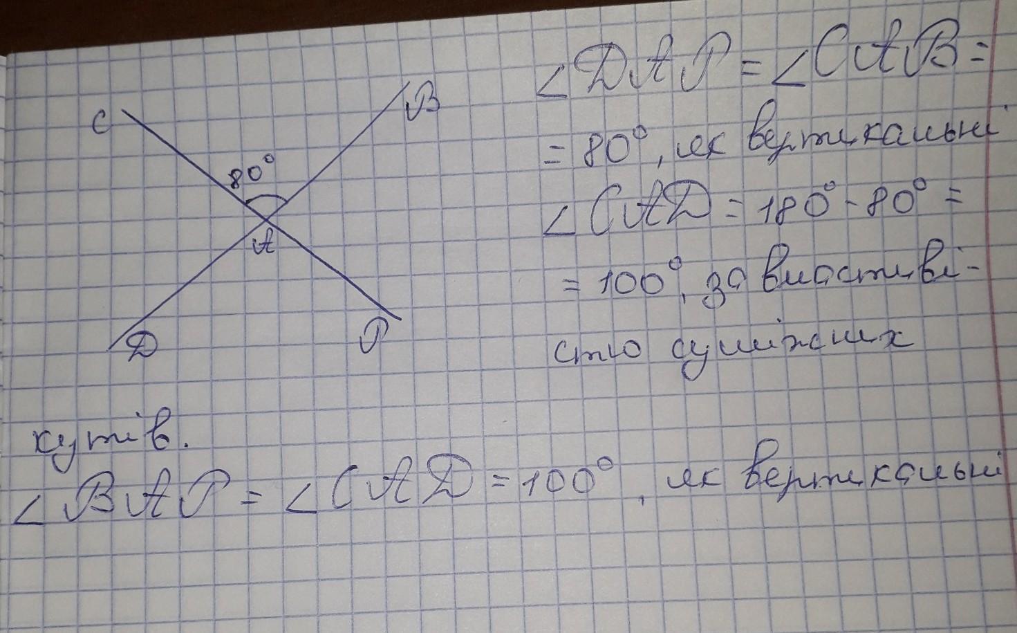 один з кутів утворених при перетині двох прямих дорівнює 80 знайдіть 3 інші кути