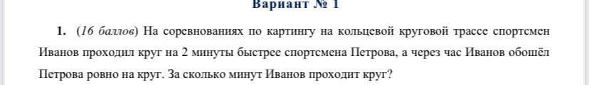 Пусть первый гонщик проходит 1 круг за х минут, тогда второй гонщик проходил один круг за (х-2) мин (так как ему по условию требовалось на 2 минуты меньше, чем первому).