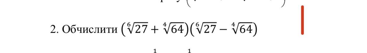 \displaystyle(\sqrt[6]{27}+\sqrt[4]{64})(\sqrt[6]{27}-\sqrt[4]{64})=27^\frac16\cdot27^\frac16-27^\frac16\cdot64^\frac14+64^\frac14\cdot27^\frac16-64^\frac14\cdot64^\frac14=