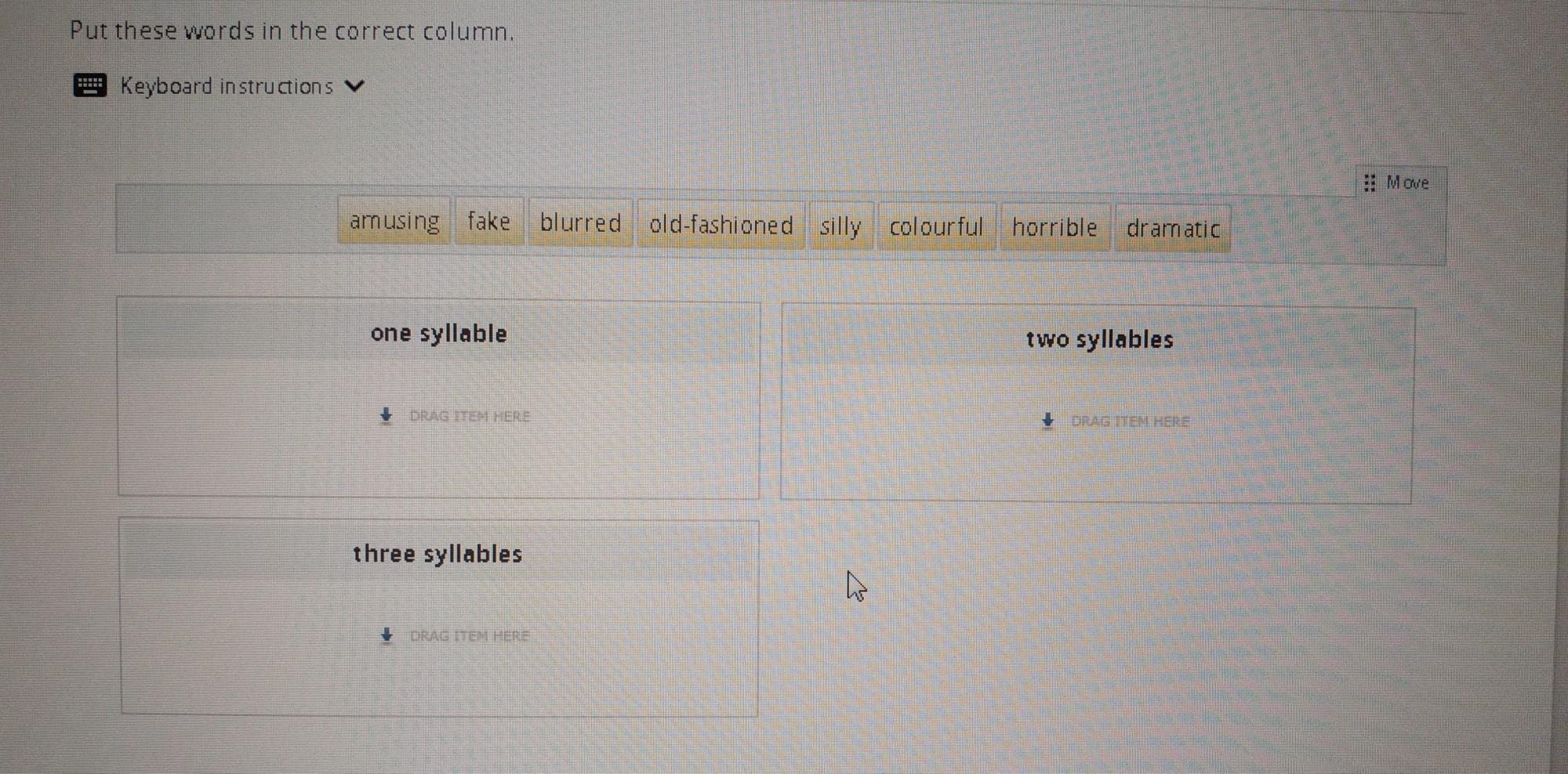 three syllables: amusing, old-fashioned, colourful, horrible, dramatic.
