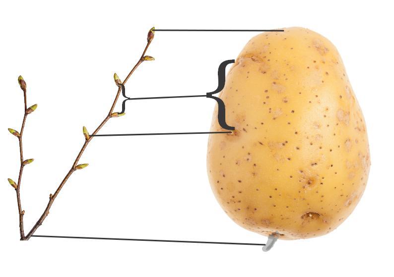 Рассмотрите рисунок, запишите признаки, доказывающие, что клубень – это видоизменённый подземный побег.
