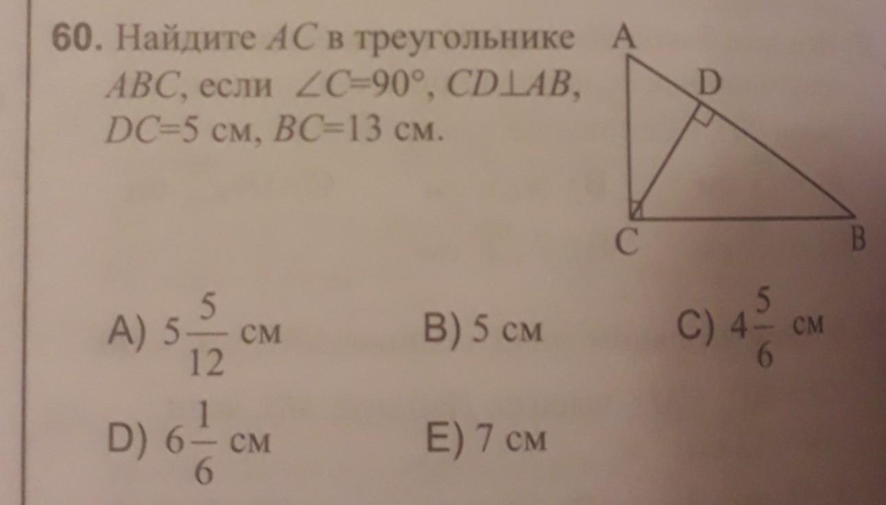 СД/АС = ВД/ВС, отсюда АС = СД*ВС/ВД = 5*13*12 = 65/12 = 5 5/12.