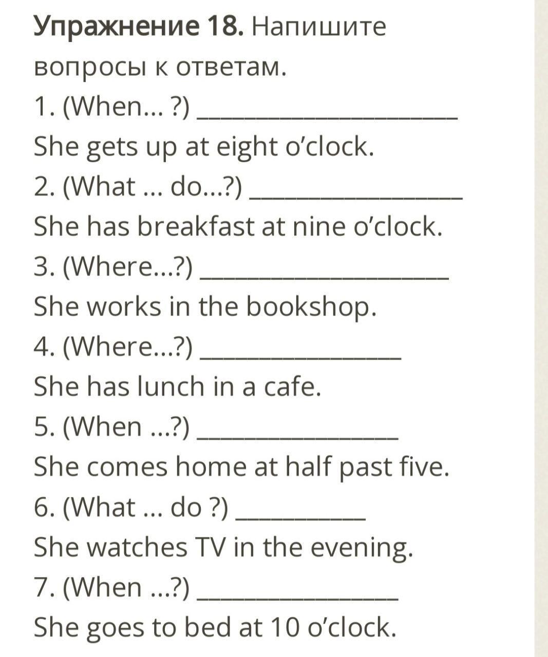Відповідь:1) when does she get up?2) what does she do at 9 o'clock?3) where does she work?4) where does she get lunch?5) when does she come home?6) what does she do in the evenings?7) when does she go to bed?