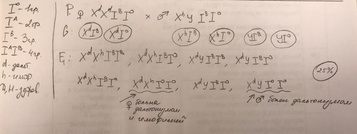 Родители гетерозиготны по III группе крови, при этом мать - дальтоник, а отец – гемофилик. Определите вероятность рождения детей с I группой крови, больных указанными болезнями.