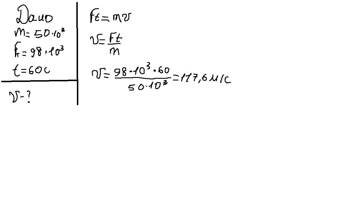 Потяг масою 500 т після припинення тяги локомотива під дією сили тертя, яка дорівнює 98 кН, зупиняється через 1 хв. З якою швидкістю їхав потяг?