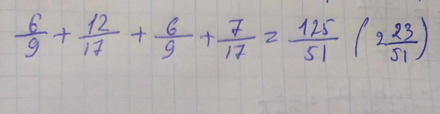 6/9+12/17+6/9+7/17= 12/9 + 19/17 = 1 3/9 + 2 2/17 = 1 1/3 + 2 2/17 =