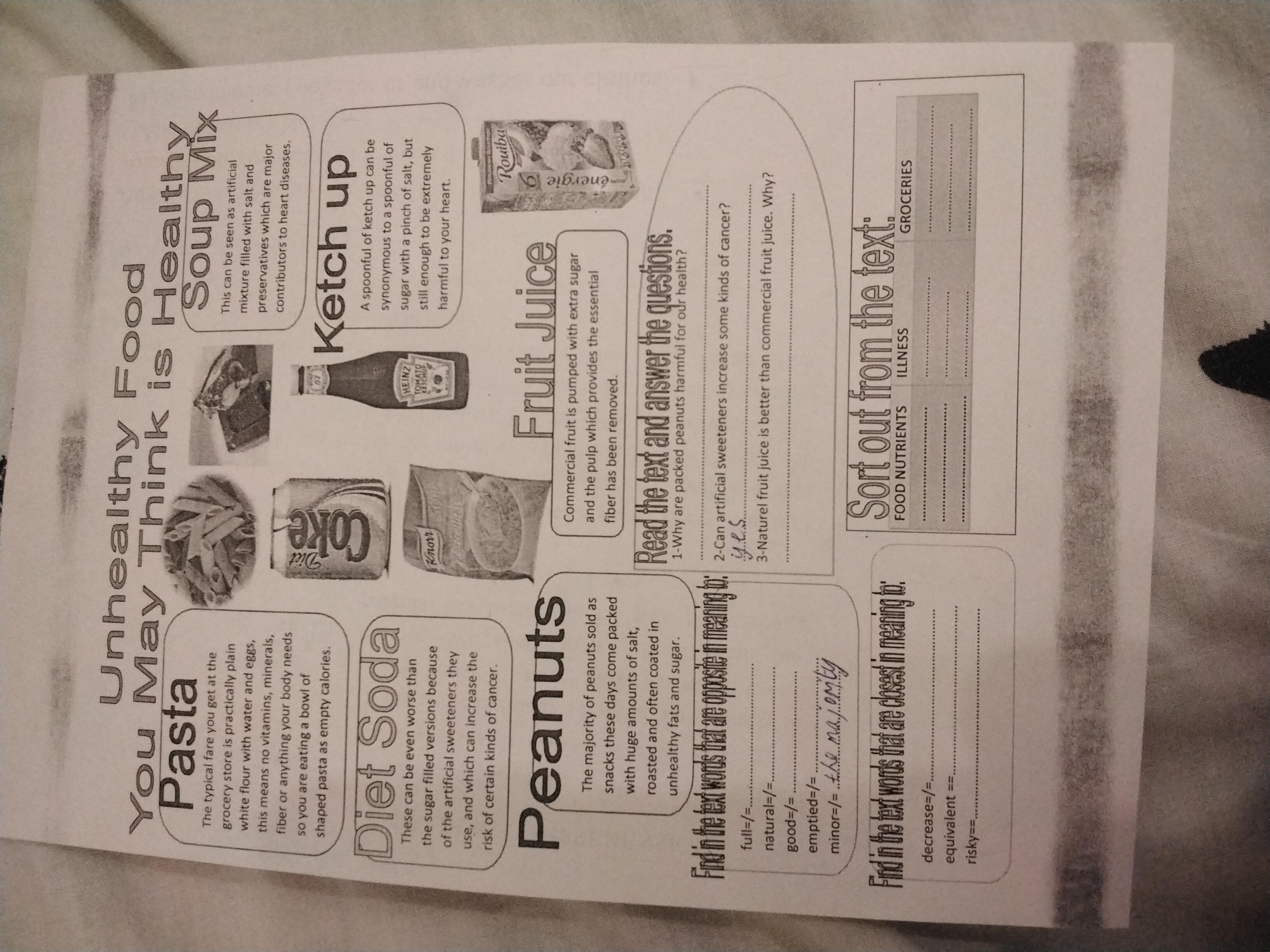 Read the text and answer the questions: 1-Because they are come packed with huge amount of salt, they roasted and often coated in unhealthy fats and sugar3-because commercial fruit is pumped with extra sugar and the pulp.Fill in the text words that are opposite in meaning to: full-empty,natural-хз emptied-filled Fill in the text words that are closest in meaning to:decrease-shrink,eqiuvalent-similar,risky-dangerous.Sort out from the text food nutrients-fats, дальше хз illness-cancer, hearth attack, groceries-pasta, peanuts,soup mix