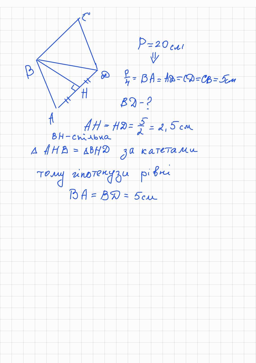 5. Висота, проведена з вершини тупого кута ром- ба, ділить протилежну сторону пополам. Об- числити меншу діагональ ромба, якщо його периметр дорівнює 20 см.