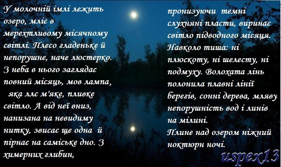 уживаючи слова з повторювальними плавними приголосними ,опишіть місячну ніч на озері або літній ранок
