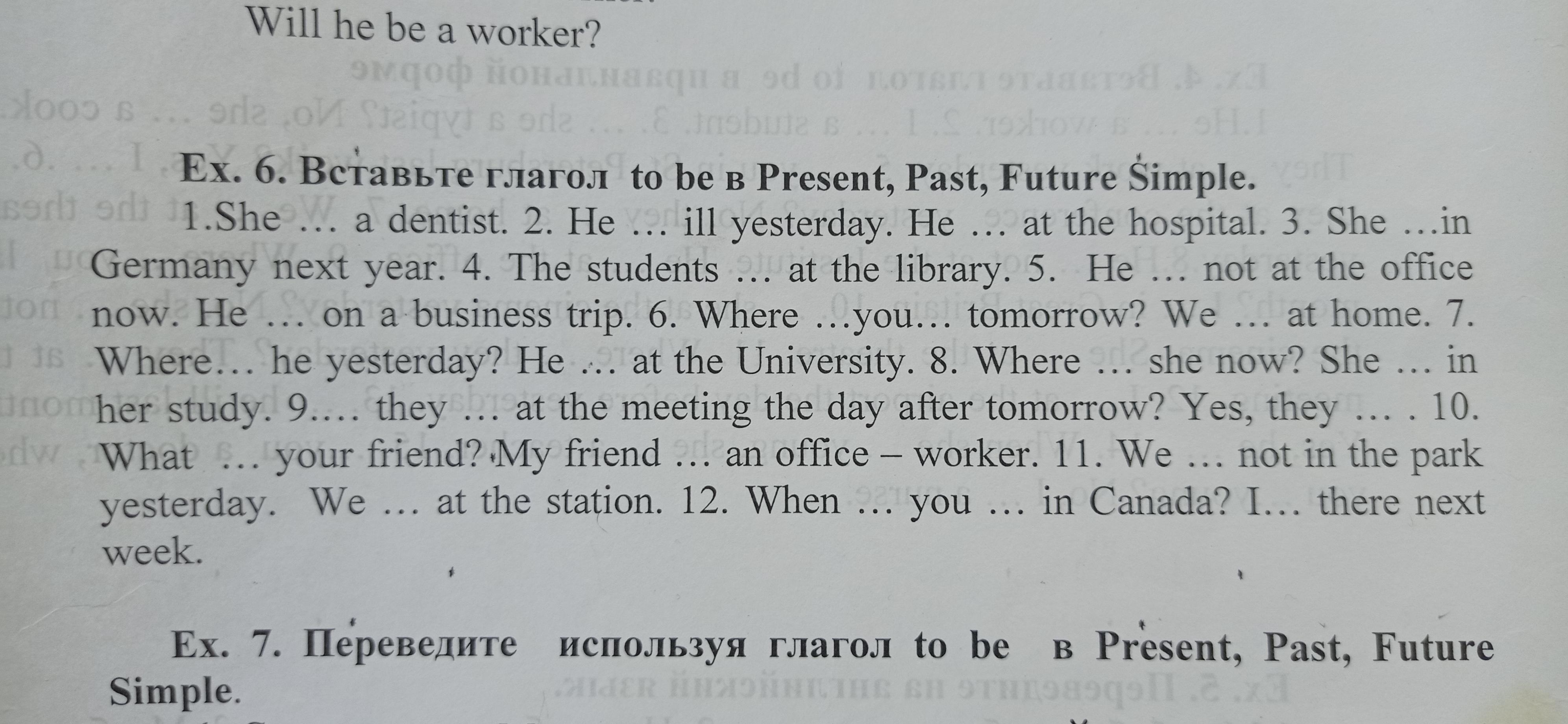 She is a dentist.He was ill yesterday.He is at the hospital.She will be in Germany next year.The students are at the library.He is not at the office now.He is on a business trip.Where will you be tomorrow?We are at home.Where was he yesterday?He is at the University.