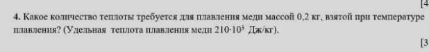 4. Какое количество теплоты требуется для плавлення меди массой 0,2 кг, взятой при температуре плавления? (Удельная теплота плавлення мели 210 * 10 ^ 3 Дж/кг).