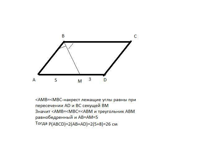 Бісектриса кута B паралелограма ABCD ділить сторону AD на відрізки AM і MD . Знайдіть периметр паралелограма, якщо AM = 5 см, MD = 3 см