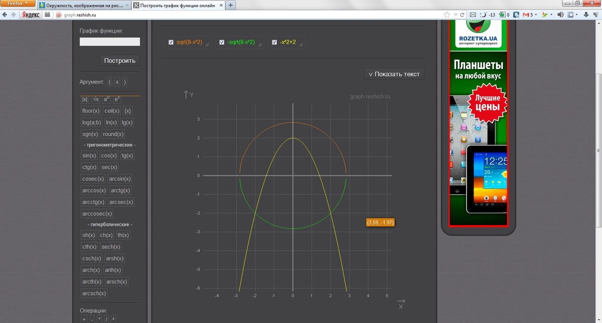 Окружность, изображенная на рисунке, задается уравнением x^2 + y^2 = 8, а парабола - уравнением y = -x^2 + 2. Вычислите координаты точки А.