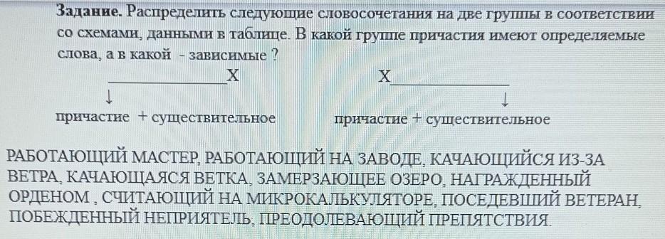 1-ая группа: работающий мастер, качающаяся ветка, замерзающее озеро, поседевший ветеран, побежденный неприятель. В этой группе главное слово - существительное, а зависимое - причастие. Во второй группе все остальные словосочетания