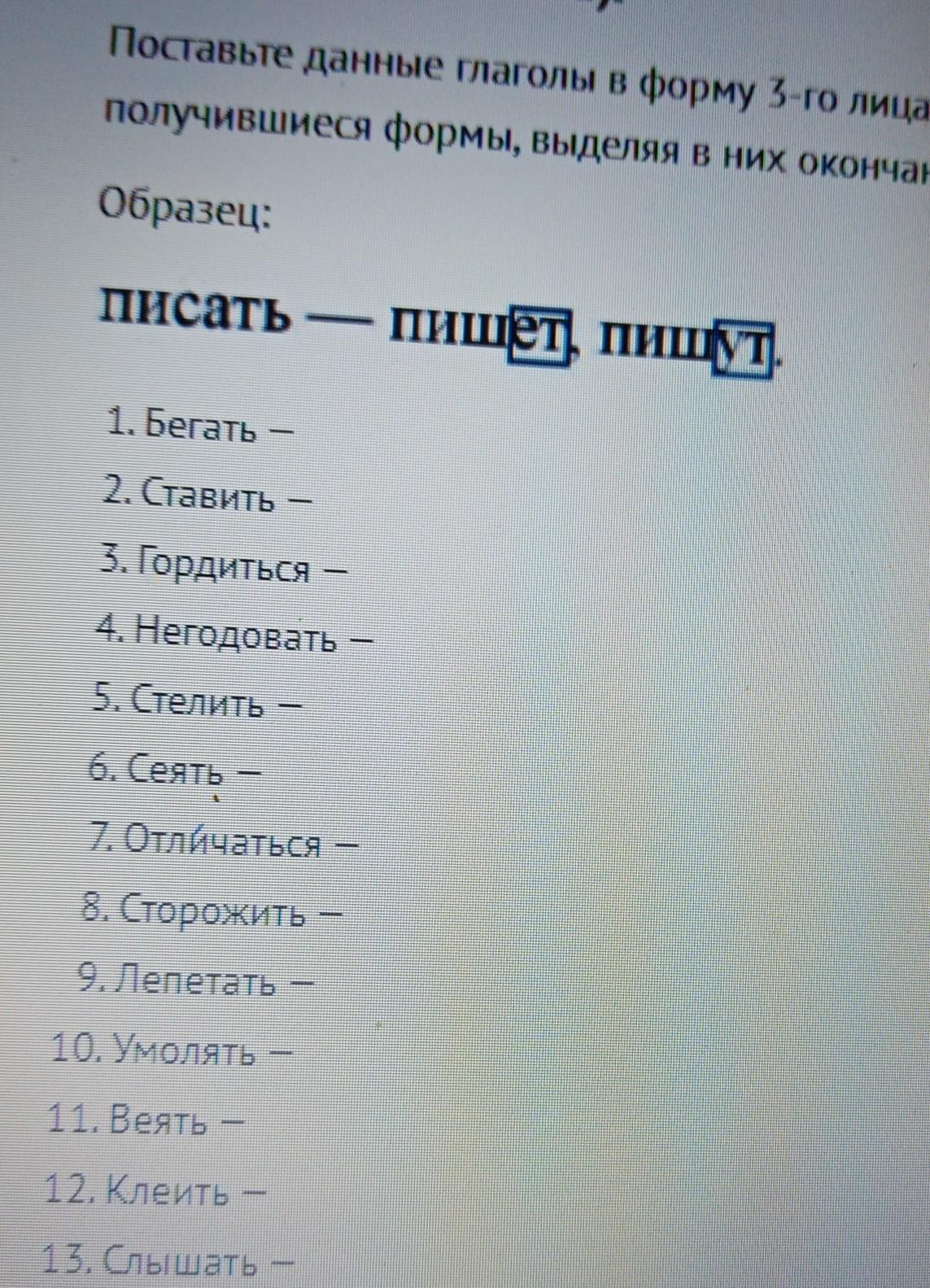 Ответ:бегает, ставит, гордится, негодует, стелит, сеет, отличается, сторожит, лепечет, умоляет, веет, клеет, слышит