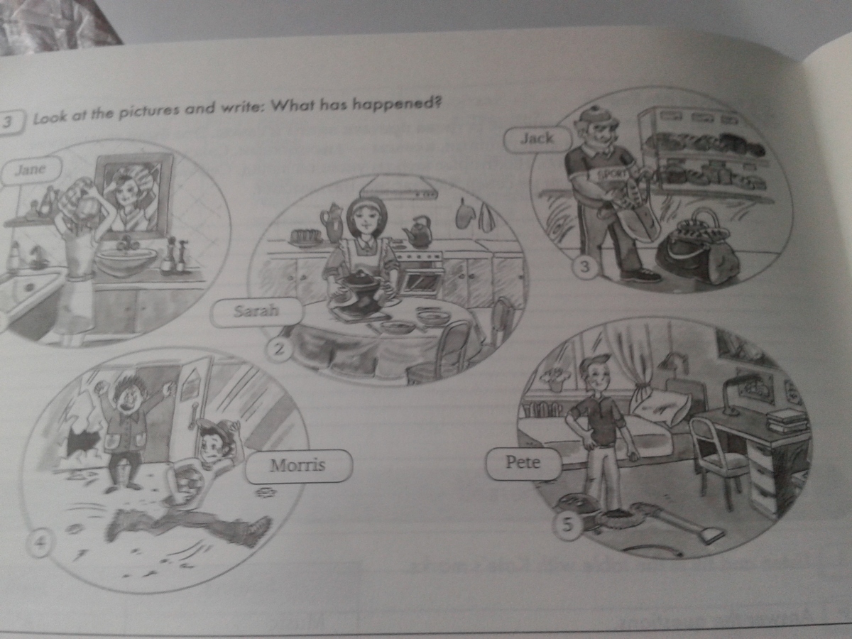 Jane has washed her hair. Sarah has made dinner. Jack has bought products. Morris has broken the window. Pete has cleaned his room.