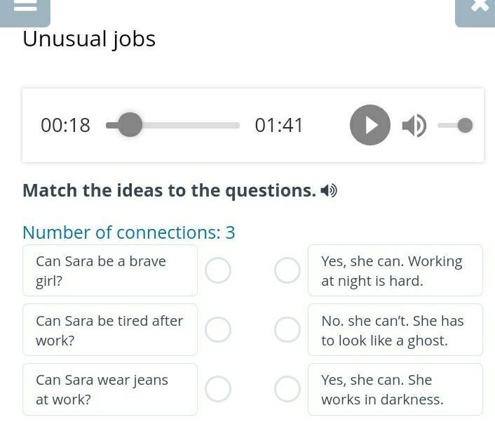 3 Unusual jobs ; Match the ideas to the questions. 1) Number of connections: 3 Can Sara be a brave girl? Yes, she can. Working at night is hard. Can Sara be tired after work? No. she can't. She has to look like a ghost. Can Sara wear jeans at work? Yes, she can. She works in darkness.