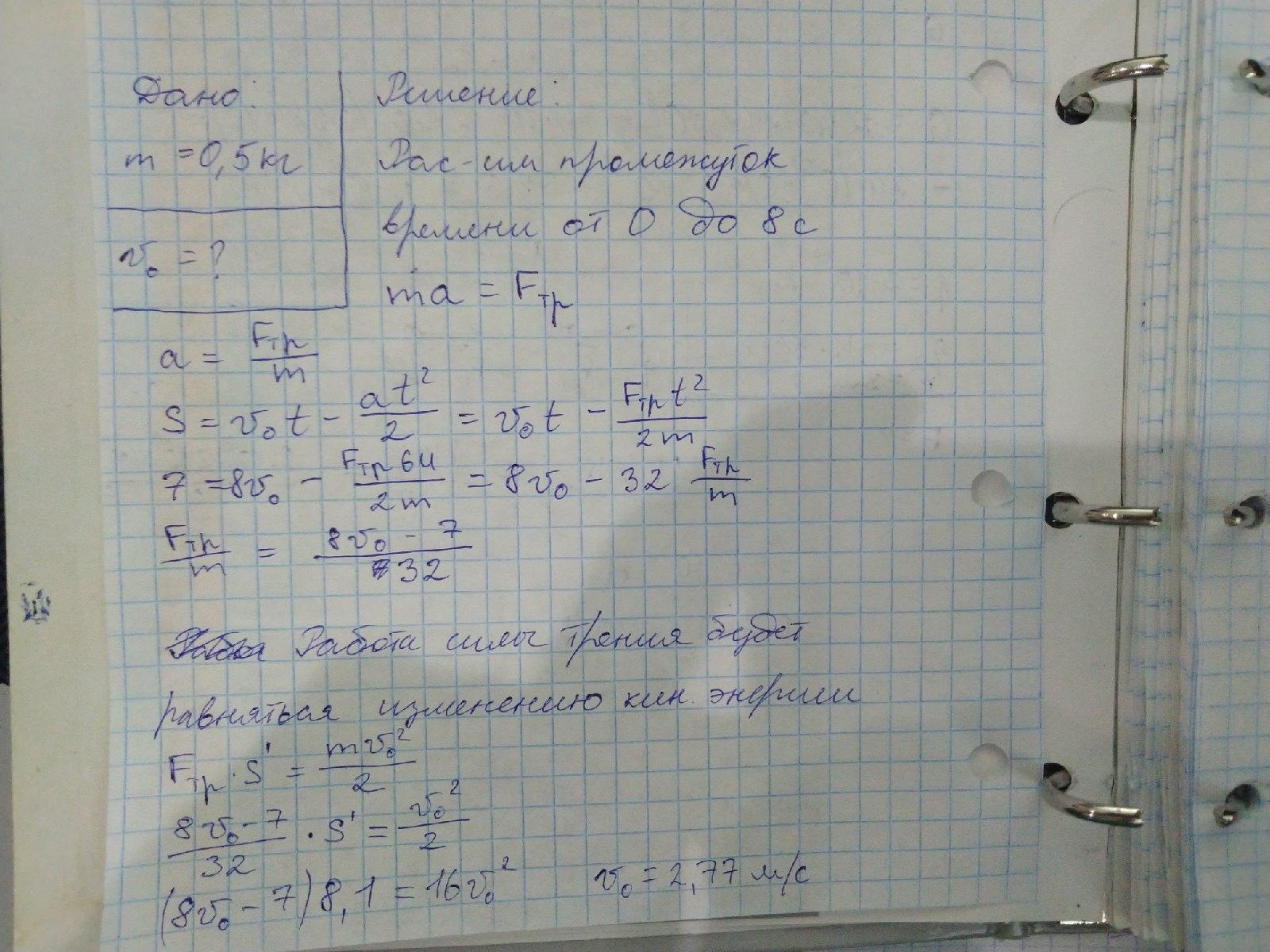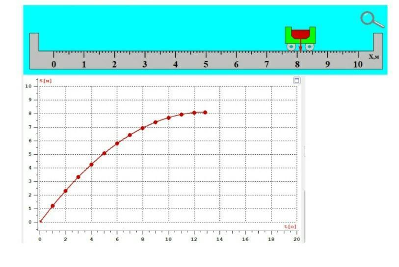 Тележка массой m = 0.5 кг начинает движение с некой начальной скоростью V0. При этом на неё действует постоянная сила трения FTP. По графику зависимости пути от времени найдите с точностью до сотых начальную скорость тележки.