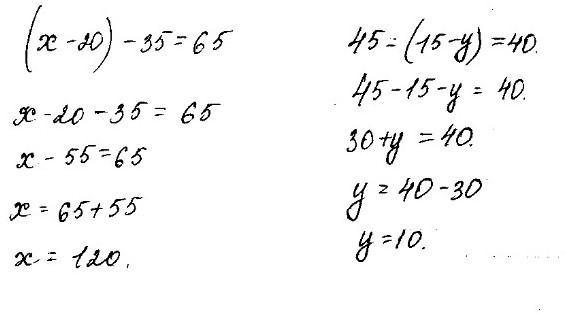 корінь рівняння (х-20)-35=65 i 45=(15-y) =40
