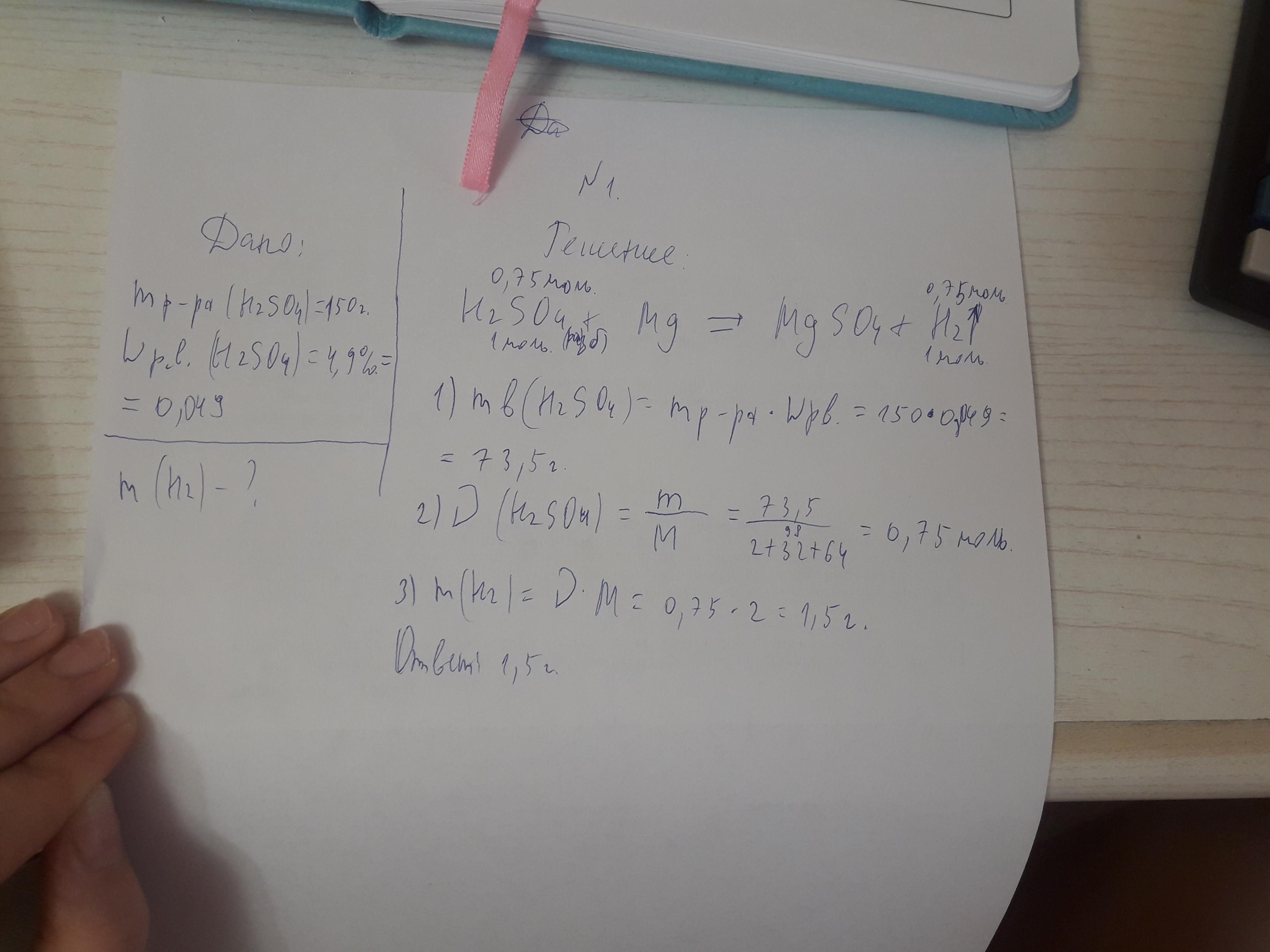 Обратите внимание, что дан 4.5% раствор, делаем вывод, что H2SO4 разбавленная (концентрированной считается свыше 50%). В дано я сразу перевела массовую долю из процентов в долю единицы, чтобы не таскать 100% с собой в решении. По уравнению реакции могу сказать: в реакциях разбавленных HNO3 H2SO4 металлов, все металлы, стоящие в ряду напряжения металлов до водорода, вытесняют вдород и образуют соль. Уравнялось без коэффициентов. 1. Первым действием нашла массу вещества H2SO4. Действия над растворами через реакцию не выполняются!!! Если дана массовая доля и масса раствора, найдите массу вещества. 2. Количество вещества я нашла, чтобы с легкостью вычислить прямо в реакции колличество водорода 0.75 моль. Если знаменатели искомого и данного вещества равны (здесь по 1 моль, из уравнения реакции), то равно и колличество вещества в числителе. 3. Массу водорода перевела из количества в массу умножением на молярную массу.
