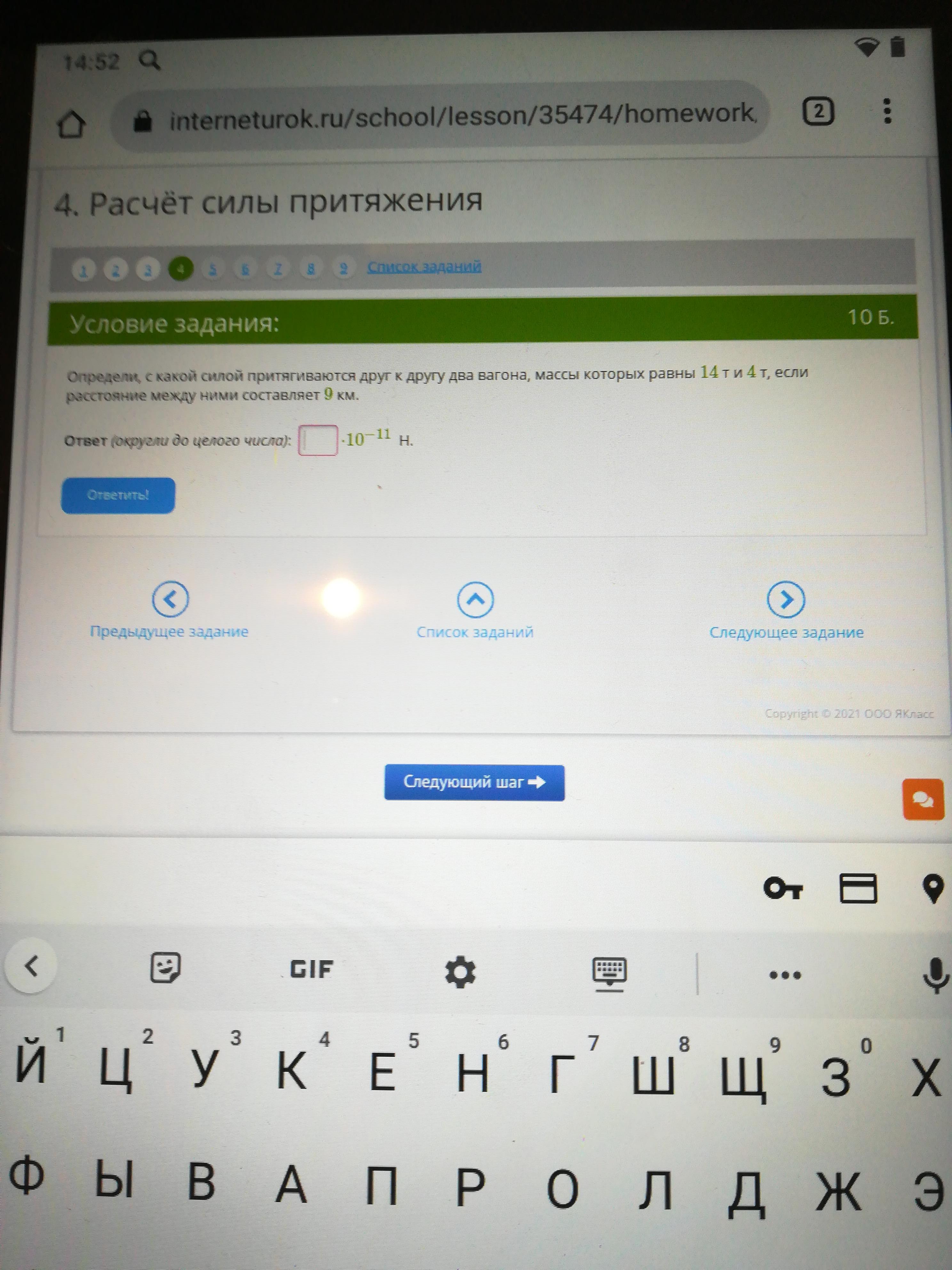 Fтяг=6.67*10^-11*14000*4000/9000^2=