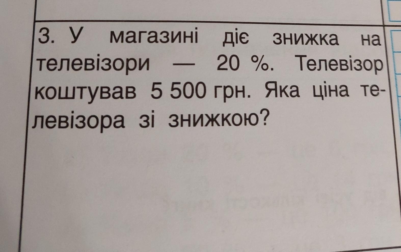 3. У магазині діє ЗНИЖка телевізори 20 %. Телевізор Коштував 5 500 грн. Яка ціна те- левізора зі знижкою?