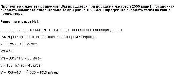 Пропеллер самолета радиусом 1,5 м вращается при посадке с частотой 2000 об/мин, скорость самолета относительно земли равна 162км\ч. Определите скорость точки на конце пропеллера.