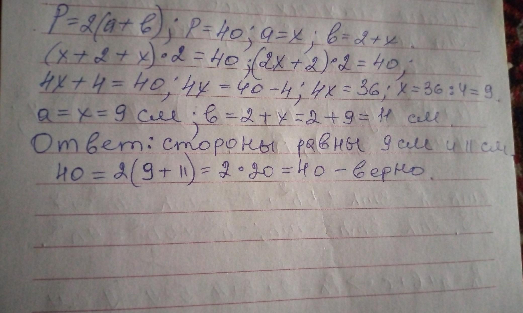 периметр прямокутника дорівнює 40 см Знайдіть його сторони якщо одна з них на 2 см менша за другу