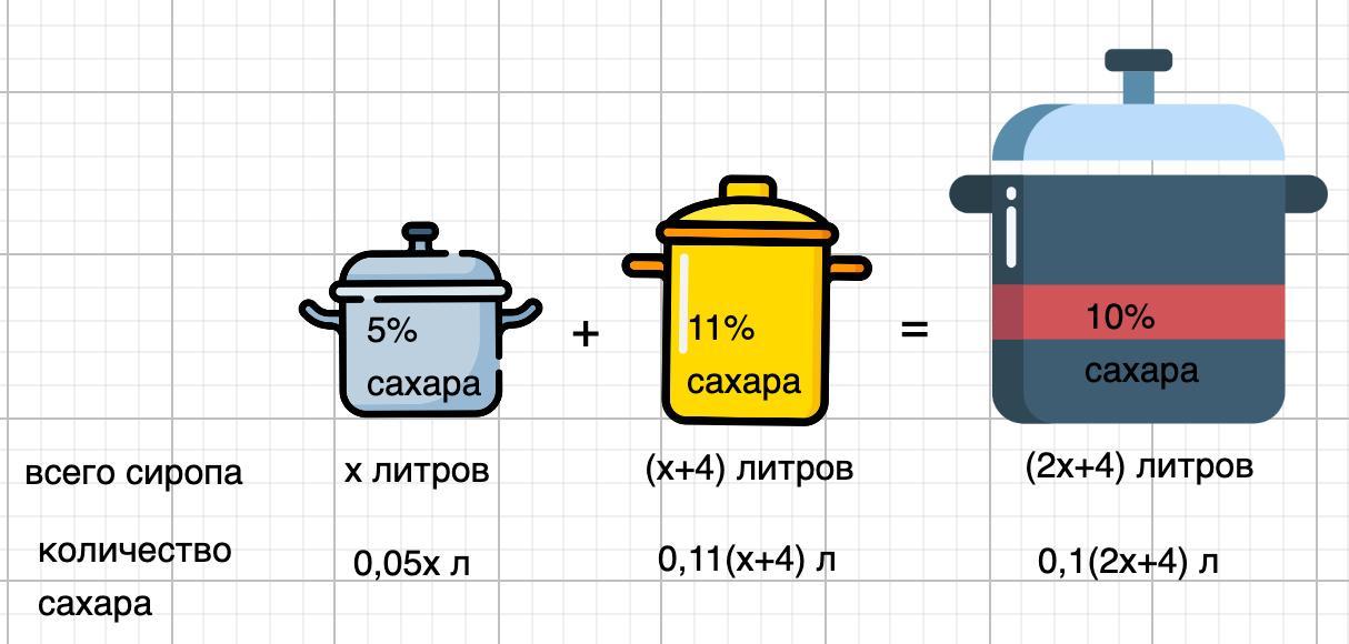студенческой столовой для чая варят два сиропа. В первой кастрюле содержание сахара 5% сахара, во второй - 11% . Масса второго сиропа больше массы первого на 4 литра. Сироп из этих двух кастрюль сливаем в общий бак и получаем содержание сахара 10%. Определите сколько литров сиропа содержится в баке.