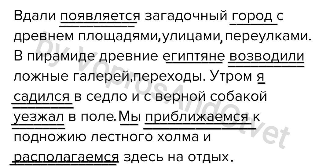 Вдали появляется загадочный город с древнем площадями улицами переулками. В пирамиде древние египтяне возводили ложные галерей,переходы. Утром я садился в седло и с верной собакой уезжал в поле Мы приближаемся к подножию лестного холма и располагаемся здесь на отдых подчеркнуть подлежащее и сказуемое