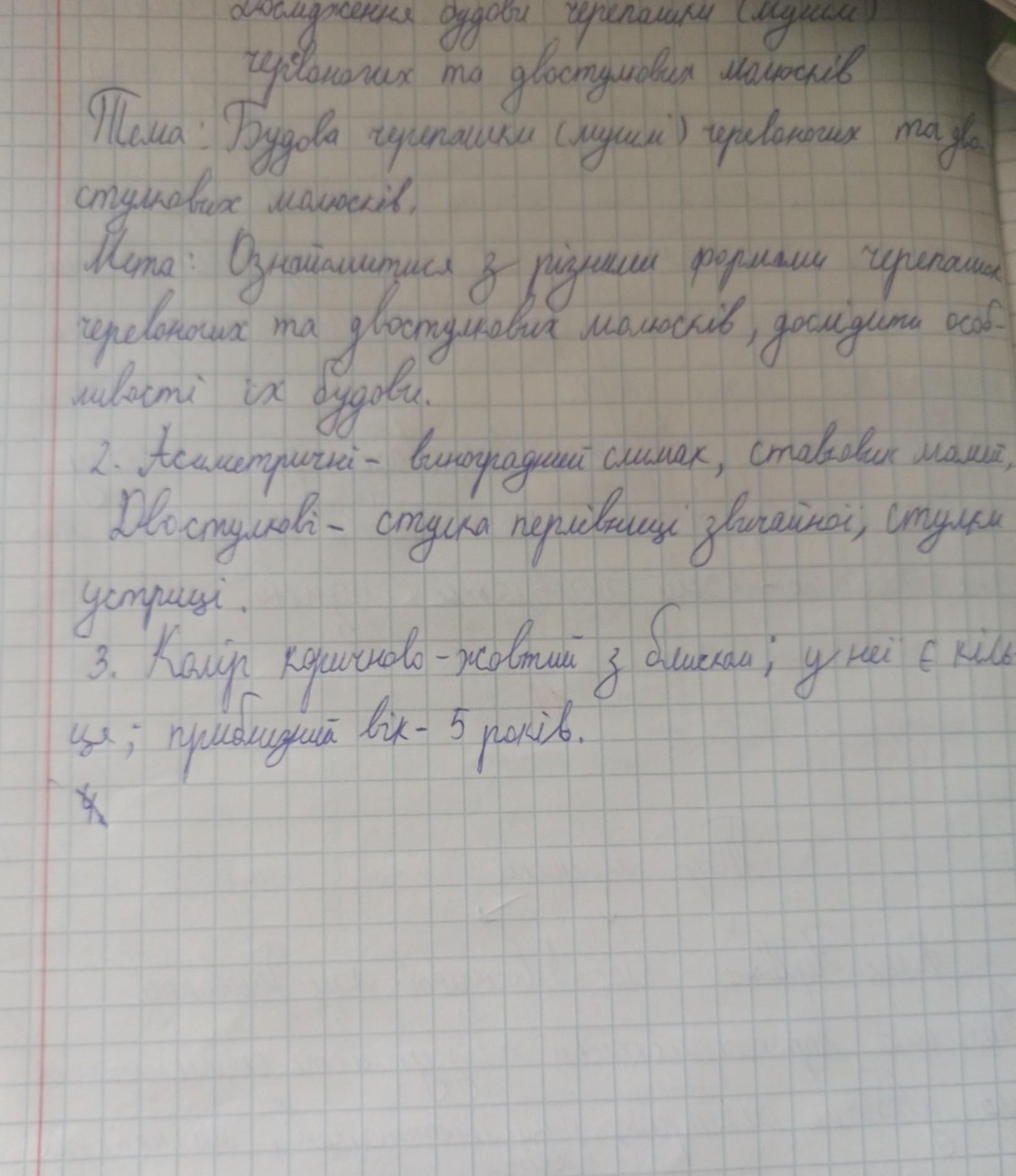 3. Розгляньте черепашку беззубки. Зверніть увагу на зовнішній шар. Який колір вона має? Чи є на черепашці кільця, подібні до річних кілець дерев? Визначте вік черепашки.