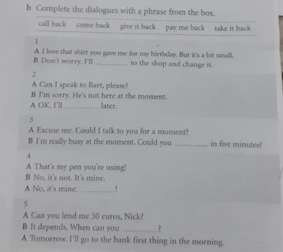 b Complete the dialogues with a phrase from the box. call back come back give it back take it back pay me back 1 A I love that shirt you gave me for my birthday. But it's a bit small. B Don't worry. I'll to the shop and change it. 2 A Can I speak to Bart, please? B I'm sorry. He's not here at the moment. A OK. I'11 later. 3 A Excuse me. Could I talk to you for a moment? B I'm really busy at the moment. Could you in five minutes? 4 A That's my pen you're using! B No, it's not. It's mine, A No, it's mine. 5 A Can you lend me 50 euros, Nick? B It depends. When can you ? A Tomorrow. I'll go to the bank first thing in the morning.