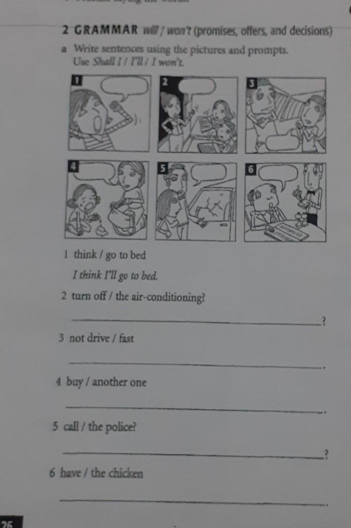 a a Write sentences using the pictures and prompts. Use Shall I / I'll / I won't
