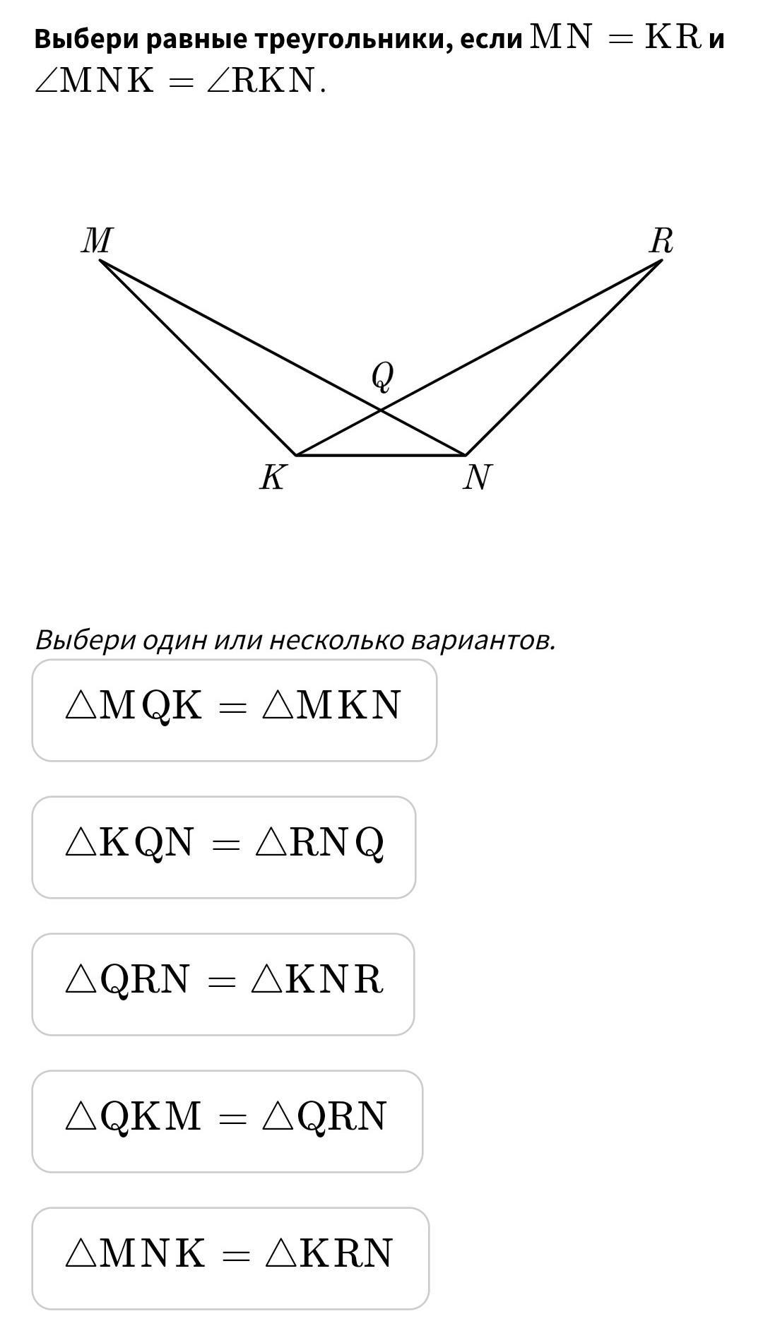 Треугольники MKN=KRN, т.к. у них две стороны равны и имеется угол между ними (это 1 признак равенства треугольников)