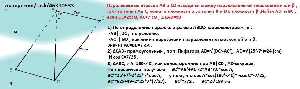 Параллельные отрезки АВ и DC находятся между параллельными плоскостями α и β , так что точки А и С, лежат в плоскости α , а точки В и D в плоскости β .Найти АD и ВС , если DC=25см, АС=7 см , ∠САD=90°